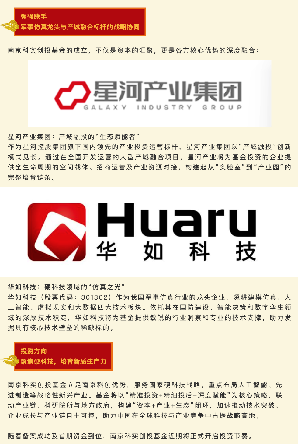 本支基金汇聚了产业界与实业界的顶尖力量,主要出资方包括创业板上市企业、军事仿真领域龙头北京华如科技股份有限公司(以下简称“华如科技”),以及国内领先的产城融合运营商星河产业集团。